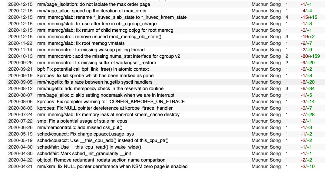 刚毕业的这一年,我的生活简单又纯粹:除了上班做好本职工作,休息时便埋首 Linux 源码,写代码解析笔记,再把这些内容分享到不同渠道。说实话,那时的分享并不全然纯粹,我也带着一点对知名度的期许,希望能为自己的未来,谋求一份更好的“机缘”。2018 年,我写了 6 篇 CFS 的代码解析分享,也顺理成章地向 Linux 内核社区发送了自己的第一个 patch,初衷是修复 CFS 调度器的 vruntime 的计算错误问题。从这一个 patch 开始,我向社区提交 patch 的脚步,便一发不可收拾。