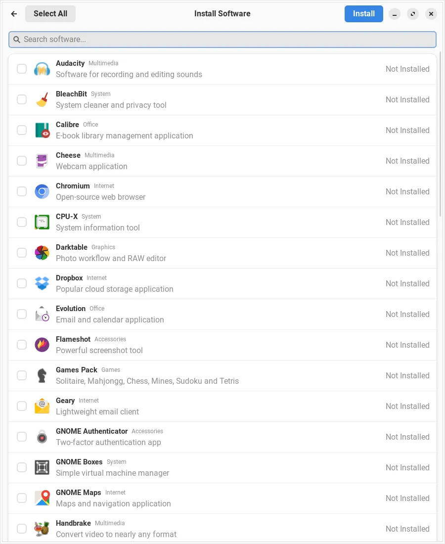 Linux Lite 7.8 进一步强化了 Software Manager(软件管理器) 的默认应用集合,新加入了 20 多款主流工具,覆盖日常办公、多媒体、系统维护等多个领域。