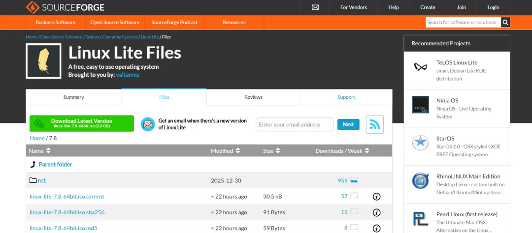 ISO 镜像大小约 3 GB,可通过 SourceForge 镜像下载。