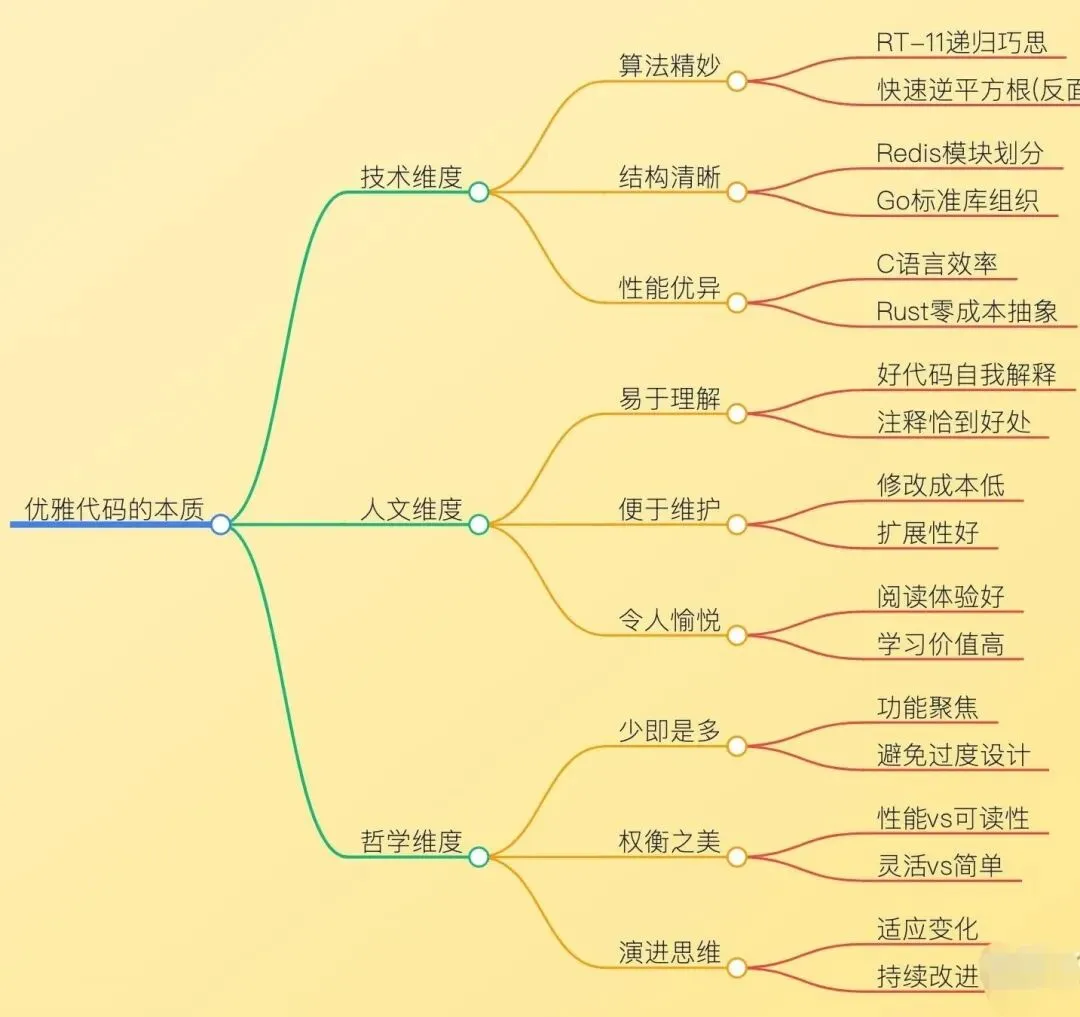 下图是从知乎上拷贝下来的,从3个维度总结了优雅代码的本质,总结得很好: