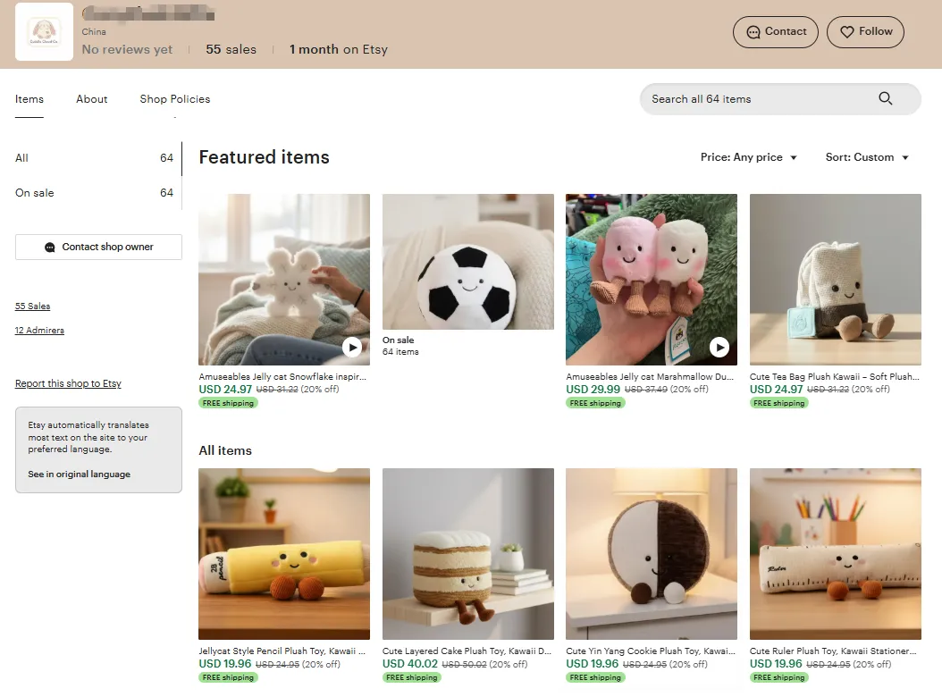 “动动手指改个代码,就能绕过限制开Etsy中国店了”——这类诱人的话题迅速在社交平台发酵,我在论坛里看到非常多的帖子,像改代码这种诱人的“捷径”正瞄准急于入驻Etsy的中国卖家。手工饰品、原创设计等品类在Etsy上的高溢价,让无数国内卖家心动不已,而平台暂未向中国大陆主体开放直接注册的规则,还是让不少人去尝试改网页数据区强开中国店。这种方式长不长久很多人早就证明了:改代码入驻不仅行不通,更会让你永久封号、身份会被Etsy拉黑!改代码只是篡改前端页面,让注册页出现“china”选项,后端平台不认可,风控会实时标记地区信息异常、操作轨迹异常,触发审核即封店。即使侥幸注册成功,后续绑定国内IP、国内收款/物流信息会暴露矛盾,二次审核直接永久封禁,身份、银行卡还会进黑名单,以后再注册也会被拒。不出意外直接噶,所谓的稳定只是暂时的,2025年以来改代码店封店率接近百分之百,资金、Listing、前期投入全打水漂,没有任何申诉空间。 适用于:个人/香港公司,Etsy对香港地区完全开放。所需材料:护照、香港收款账户(万里汇、香港银行账户)、海外邮箱(Gmail或者Outlook)、Visa或者万事达双币信用卡。这种就非常适合长期经营的大陆卖家,百分百合规,没有地区限制,长期稳定,直接可以从香港发货。2)海外的朋友/或者合伙人本土注册(安全、零风险)海外有亲人或者朋友的,可以用对方当地身份、地址、电话、收款账户注册、然后你负责运营。如果是其他的朋友可签订书面合作协议等,可以避开纠纷问题。如果说你想快速上线,觉得注册流程太麻烦了,可以拿现成的店铺,拿到之后再安全的环境下,养一段时间就可以正常上架运营。首先就是店铺必须是真人注册、没有违规记录、可安全转移迁移给你(优先美国和东南亚),必须要非常靠谱的渠道,不然后期因为什么原因被封,没有保障。优先走正规渠道去拿店,到手先看邮箱是否可更换,然后修改密码,检查店铺各方面信息。我这有现成Etsy真人店铺,需要的可以添加:XA99TB适合有优质原创产品,身份之前没有注册过,所需材料:大陆身份证、第三方收款(派安盈)、双币信用卡。名额是有限的,审核非常严格,必须满足平台对“原创、手工、独特”的核心要求,并不是人人可走的。文末可联系我助你开通(备注etsy开店)通过我们合规渠道注册的中国店铺,销量也不落后美国及其他国的店铺,重要的是入驻的卖家非常合规,不会触碰etsy规则的红线,而且已经有不少出色的店铺。 这是一家毛绒玩具店铺,一个月出了50多个订单在我看来其实已经可以了,每天都可以出单,并且利润还大,主要产品也受欧美人群喜爱,这种玩具也可以带来情绪价值,谁家里没有一个可爱的玩具呢。同样新开通的香港店的销量也很可观,两者只是注册主体不一样,流量方面没有区别的。新店注册需要扣开店19美金(一次扣费),从扣费卡里直接扣除。平台基础费用:Etsy官方收取的0.2美金/商品上架费,以及6.5%的交易佣金,这是所有卖家都需要承担的标准成本。广告推广:前期新店上到30个产品之后可以适当做下推广(1$/天最低)。我建议先从轻资产模式起步,可以从一件代发或者小批量定制开始,备货成本可控制在2000-5000元人民币,在配搭基础的广告预算就可以完成冷启动。我这边也有全套的运营模式指导,无论是选品、优化SEO等流程全部整理成视频教程,需要的可以文末添加我的微信。跨境电商的道路上,从来没有捷径可走。改代码入驻Etsy的骗局,早就被无数卖家证实不可行。对于中国卖家而言,与其抱着侥幸心理触碰平台红线,不如选择合规路径稳健入场。Etsy筛选的不是会钻漏洞的聪明人,而是懂规则、有诚意的经营者。专业代入驻Etsy中国店/美企店/香港店等,总之,从开店、上架产品、物流、发货、关键词、广告转化率分析、店铺装修、后台数据分析、运营管理,还有各种各样的店铺分析,全部都有。