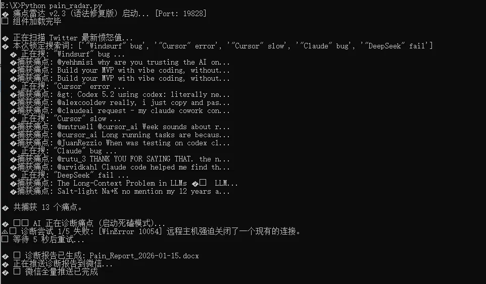 # Cognitive Hunter (认知猎手) - 全自动 AI 情报捕获系统 v5.0# Author: Lokih (深度思维合伙人)# Version: 5.0 (全生态多模态版)=========================================================================【核心价值】这不是一个简单的爬虫,这是一个“不知疲倦的产品经理”。它在你睡觉时,自动扫描 Hacker News (技术)、Twitter (舆论) 和 GitHub (工具)。它不只搬运新闻,它会用 AI 像医生一样诊断痛点,并为你生成可以直接落地的 Prompt 解决方案。=========================================================================-------------------------------------------------------------------------1. 📂 文件清单 (你的军火库)-------------------------------------------------------------------------确保你的文件夹里包含以下核心文件:[主程序]1. auto_publisher.py : 全能猎手 (v5.0)。抓痛点 -> 写 Prompt -> 发微信。2. pain_radar.py : 痛点雷达 (v2.3)。专门扫描用户的愤怒和报错,生成诊断报告。3. github_hunter.py : 开源猎手 (v3.3)。自动发现高星 AI 项目并翻译成中文简报。[配置与工具]4. cookies.json : (必须自己获取) Twitter 的登录凭证。5. run_daily.bat : 一键启动脚本。6. my_market_brain/ : (自动生成) 本地向量数据库,存储 AI 的长期记忆。-------------------------------------------------------------------------2. 🛠️ 安装步骤 (保姆级教程)-------------------------------------------------------------------------【第一步:安装 Python 环境】1. 下载并安装 Python 3.10 或更高版本 (官网: python.org)。2. ⚠️ 务必勾选 "Add Python to PATH" (添加到环境变量)。【第二步:安装依赖库】在文件夹空白处 -> 右键 -> "在终端打开" (或 CMD),运行以下命令:pip install google-genai twikit requests chromadb python-docx【第三步:获取 Twitter 通行证 (Cookies) - 最关键!】1. 在 Chrome 浏览器安装插件 "EditThisCookie"。2. 登录你的 Twitter (X) 账号。3. 点击插件图标 -> 设置(扳手) -> 选项 -> 导出格式选择 "JSON"。4. 回到插件主界面 -> 点击 "导出" (➡️ 箭头)。5. 打开本文件夹下的 `cookies.json` (如果没有就新建),粘贴进去,保存。(注意:如果运行报错,请确保 cookies.json 里只有 name, value, domain, path 四个字段,或使用提供的转换脚本)。-------------------------------------------------------------------------3. 🔑 配置你的密钥 (Config)-------------------------------------------------------------------------请右键点击以下三个 .py 文件,选择 "Edit with IDLE" 或用记事本打开,找到顶部的【用户配置区】,填入你自己的信息:1. GEMINI_KEY- 申请地址: https://aistudio.google.com/app/apikey- 作用: 驱动 AI 大脑进行思考和写作。2. PUSHPLUS_TOKEN- 申请地址: http://www.pushplus.plus/- 作用: 让报告直接推送到你的微信。3. YOUR_PORT (梯子端口)- 查看你的魔法软件设置 (通常是 7890, 7897 或 10809)。- ⚠️ 如果填错,程序会无法联网!-------------------------------------------------------------------------4. 🚀 如何运行-------------------------------------------------------------------------【方式 A:手动运行】双击 command_center.bat。黑窗口出现,代码开始滚动,代表系统启动。等待 1-2 分钟,微信收到推送,文件夹生成 Word 文档。【方式 B:全自动挂机】1. 右键 "此电脑" -> 管理 -> 任务计划程序。2. 创建基本任务 -> 每天 -> 早上 06:30。3. 操作 -> 启动程序 -> 选择 `run_daily.bat`。4. ⚠️ "起始于 (可选)" 这一栏,必须填入本文件夹的路径 (例如 E:\X\ )。-------------------------------------------------------------------------5. ❓ 常见问题 (FAQ)-------------------------------------------------------------------------Q: 程序闪退,报错 "404 Not Found"?A: Twitter 接口更新了。请打开 CMD 运行:pip install --upgrade twikit 升级库。Q: 报错 "ConnectionResetError" 或 "ProxyError"?A: 你的梯子没开,或者端口号 (YOUR_PORT) 填错了。Q: 抓不到 Twitter 数据?A: 1. 检查 cookies.json 是否过期 (重新导出)。2. 换个梯子节点 (IP 可能被风控)。Q: 生成的 Word 乱码?A: 请确保文件名没有特殊字符,或者直接看微信推送的内容。-------------------------------------------------------------------------【免责声明】本工具仅供学习与技术研究使用。请勿用于大规模爬取或商业滥用。使用本工具产生的任何后果由使用者自行承担。-------------------------------------------------------------------------Build with ❤️ by Lokih
