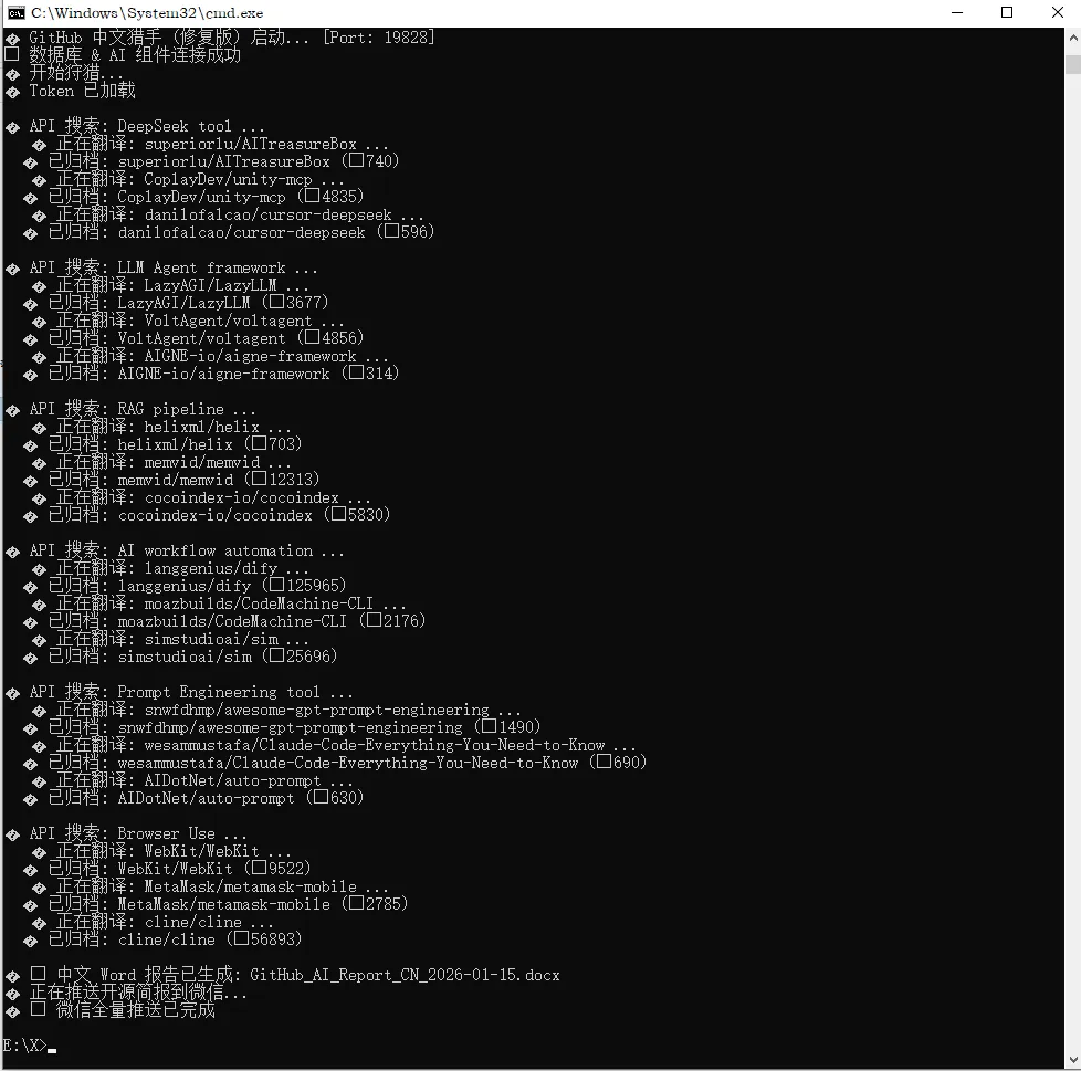 2.开源猎手:扫描军火库 它潜伏在 GitHub API 接口上。 一旦发现星数飙升的 AI 工具,立刻调用 Gemini 进行“人话翻译”。 它不发英文原本,它直接告诉我:“这个库能帮你解决 DeepSeek 联网慢的问题,核心原理是……”