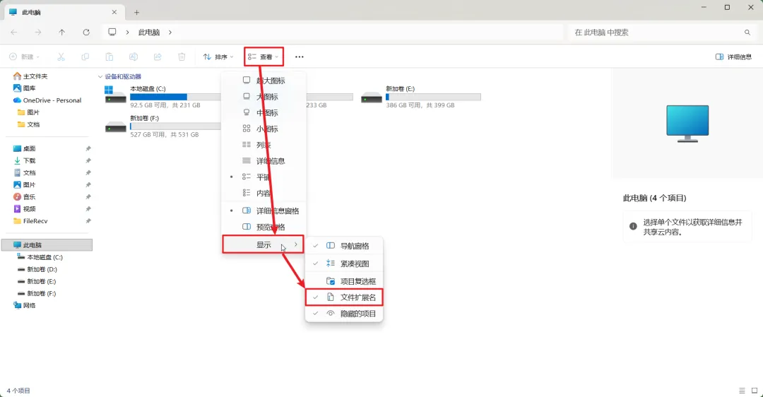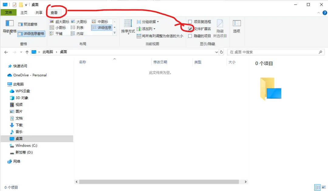 打开文件资源管理器,勾选查看中的文件扩展名就可以显示出来。