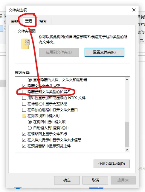 在文件夹选项中,取消勾选查看选项卡中的隐藏已知文件类型的扩展名