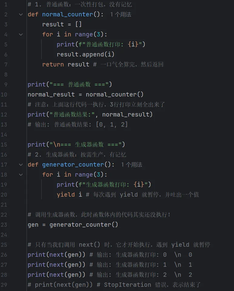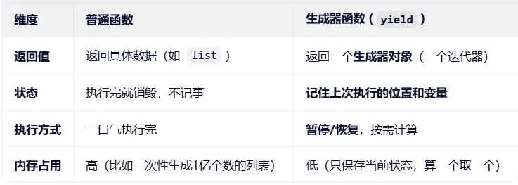普通函数像一条单行道,进去就得一口气跑到底(遇到 return 就死透了);而带有 yield 的生成器函数,像是一个可以存档读档的游戏。