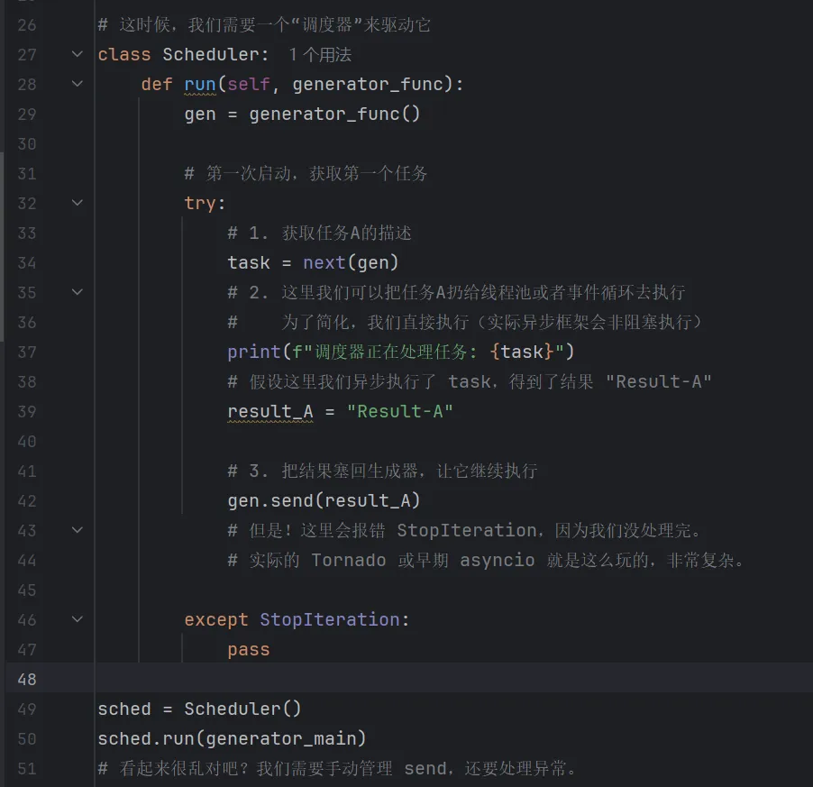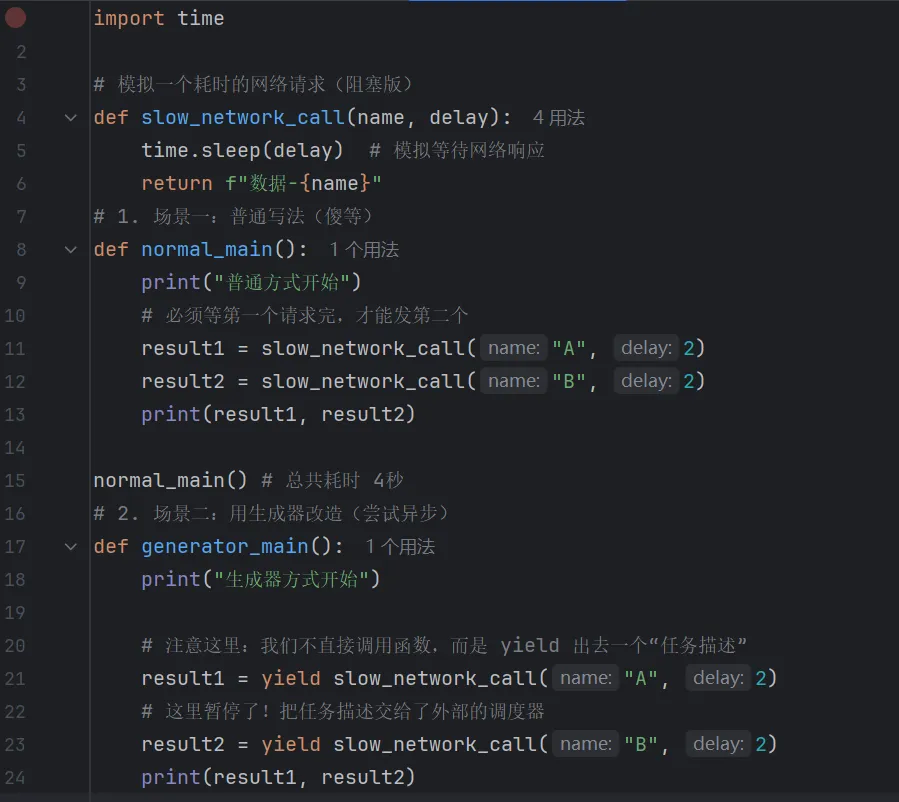 认真分析上面的程序后我们发现:用原生生成器写异步逻辑非常痛苦,你需要手动写调度器,手动 send 结果。这就是为什么后来 Python 引入了专门的语法。