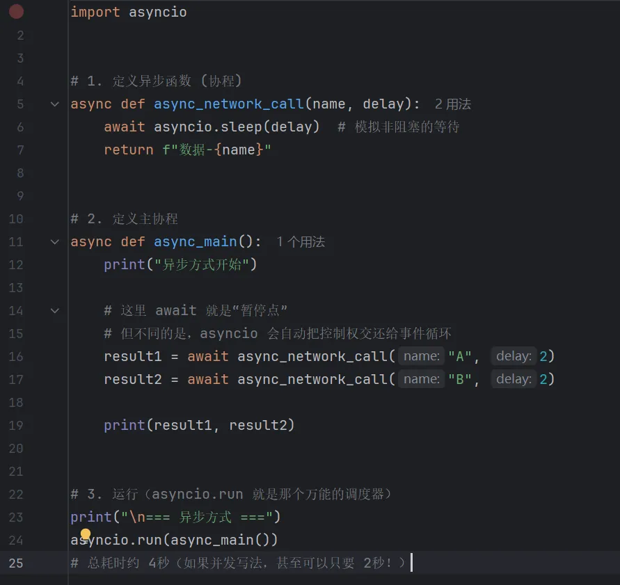 - 生成器 (def + yield):通用的暂停器。它创造了“可以暂停的函数”这一概念,这是异步编程的理论基础。