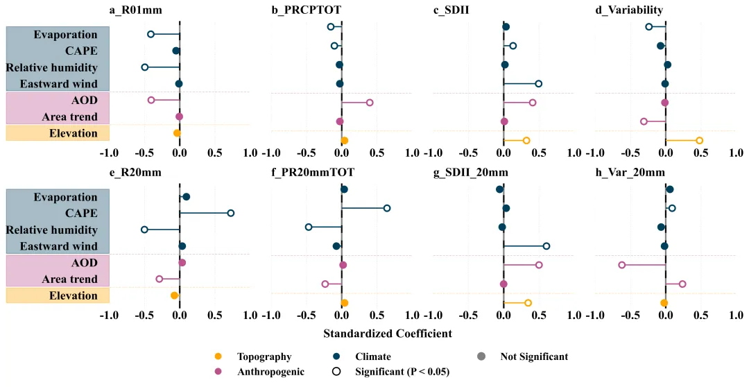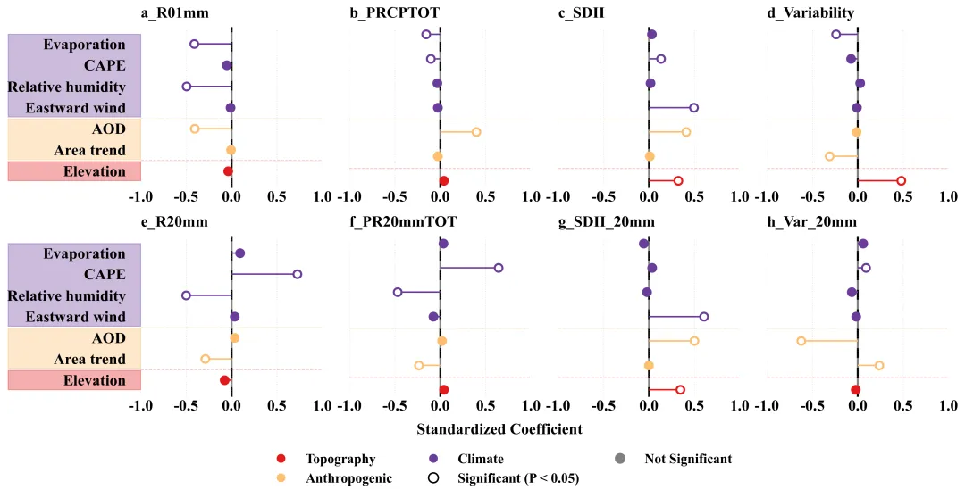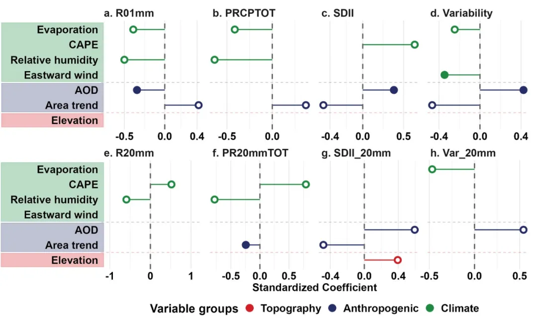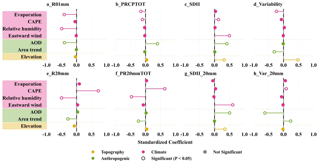 def plot_figure_9(analysis_results, driver_labels):# 创建 2 行 4 列的画布fig, axes = plt.subplots(2, 4, figsize=(16, 8))axes = axes.flatten() # 将多维子图数组展平为一维方便循环处理# 定义各驱动因子所属的分类及对应的颜色group_colors = {'Evaporation': COLOR_CLIMATE,'CAPE': COLOR_CLIMATE,'Relative humidity': COLOR_CLIMATE,'Eastward wind': COLOR_CLIMATE,'AOD': COLOR_ANTHRO,'Area trend': COLOR_ANTHRO,'Elevation': COLOR_TOPO}indices = list(analysis_results.keys()) # 获取所有需要绘图的工作表键名