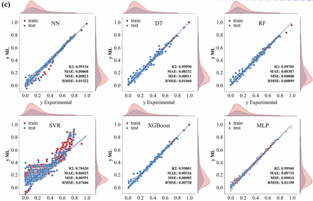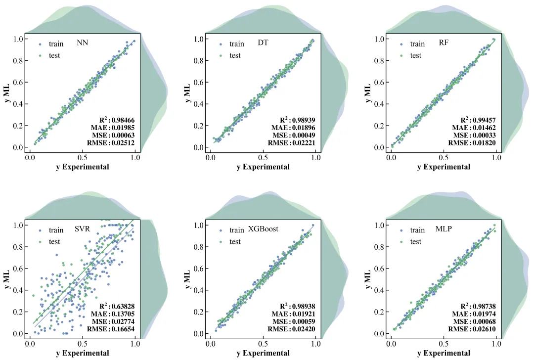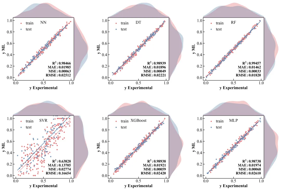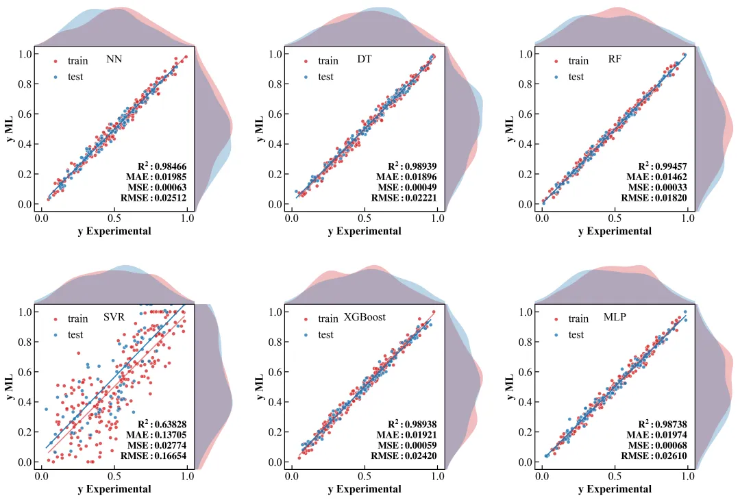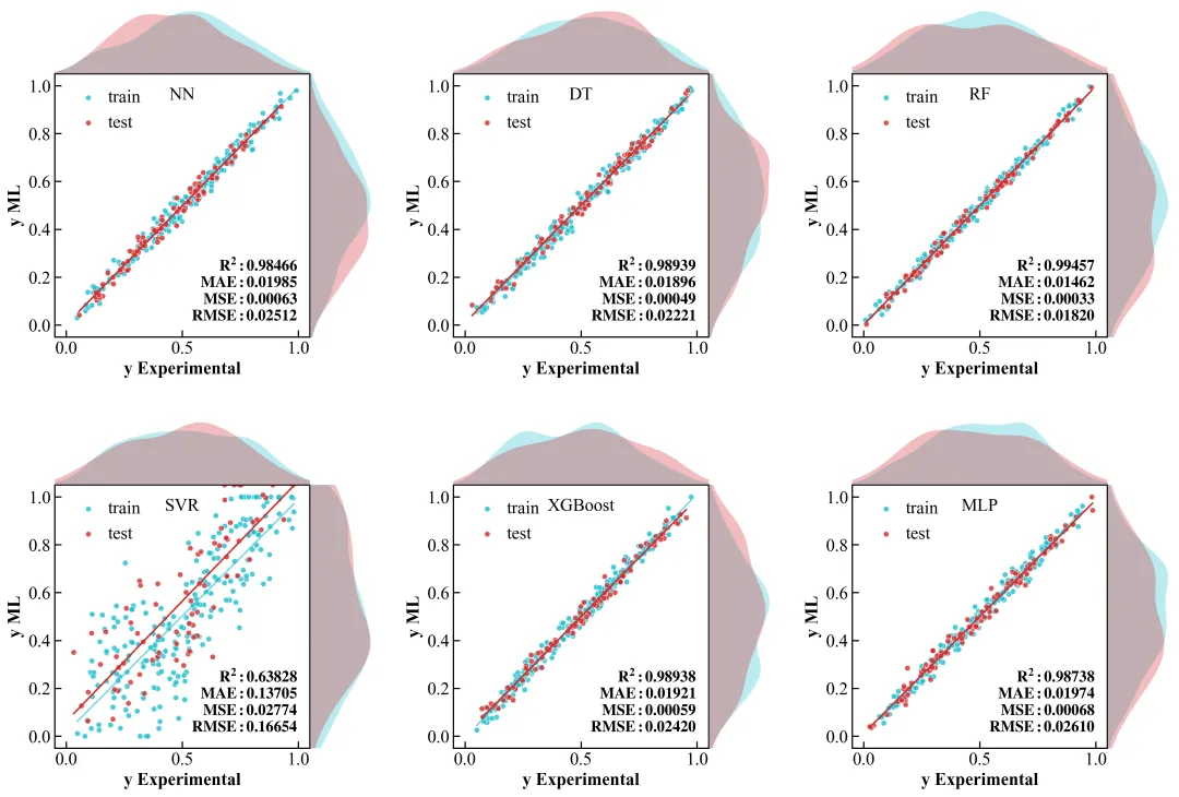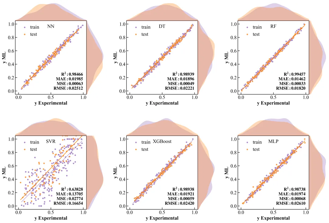 看看今天我们要复刻的这张顶刊原图:它不仅仅是一个散点图,它在 X 轴和 Y 轴的边缘,巧妙地嵌入了数据的密度分布曲线(KDE)。这就像给数据做了一次“全身CT”——中间看关联,两边看分布。更妙的是,它在一个版面内整齐排列了 6 个模型的对比(NN, DT, RF, SVR, XGBoost, MLP),并把评估指标(MAE, MSE, RMSE, R2)像铭牌一样刻在图里。