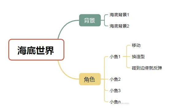 编程第一步不是直接写代码,而是用思维导图 “拆分任务”—— 这是项目策划的习惯培养, 让孩子学会把 “做海底世界” 的大目标,拆成 “背景、角色、动作” 这些能落地的小模块。