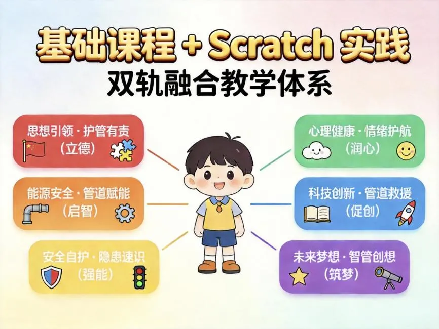 团队依托信息类专业优势,构建“基础课程+Scratch实践”双轨融合教学体系,围绕思想引领、能源安全、安全自护、心理健康、科技创新、未来梦想六大内容板块开展教学活动,将抽象的安全知识转化为可视化、可操作的编程任务,引导少年儿童在“学—做—创—展”中巩固知识、提升能力,增强课堂参与度与学习实效。