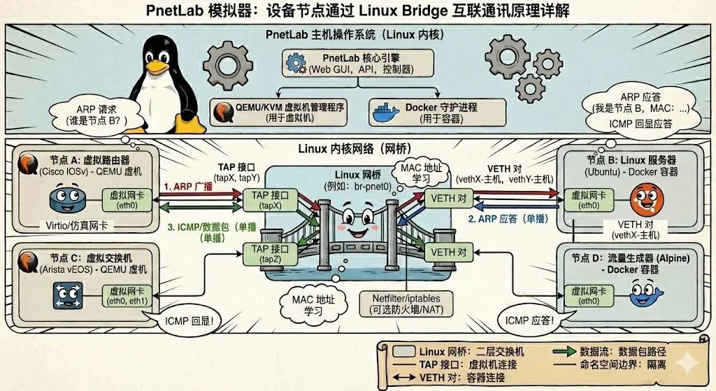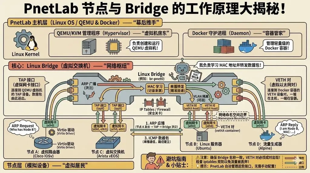 - PnetLab 的核心在于把大量网络节点(路由器、交换机、PC 终端等)放在同一个二层网络域中,通过 Linux bridge 等机制实现节点之间的直接数据帧转发。