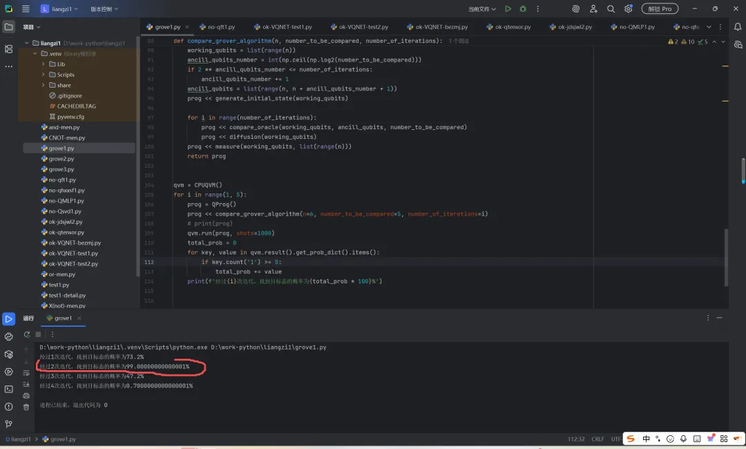 张守辉老师给大家分享在本源量子编程平台Qpanda上使用python语言,通过6个量子比特实现grove算法的典型案例讲解和程序调试验证,做2次迭代,找到目标态的概率为99.00000000000001%