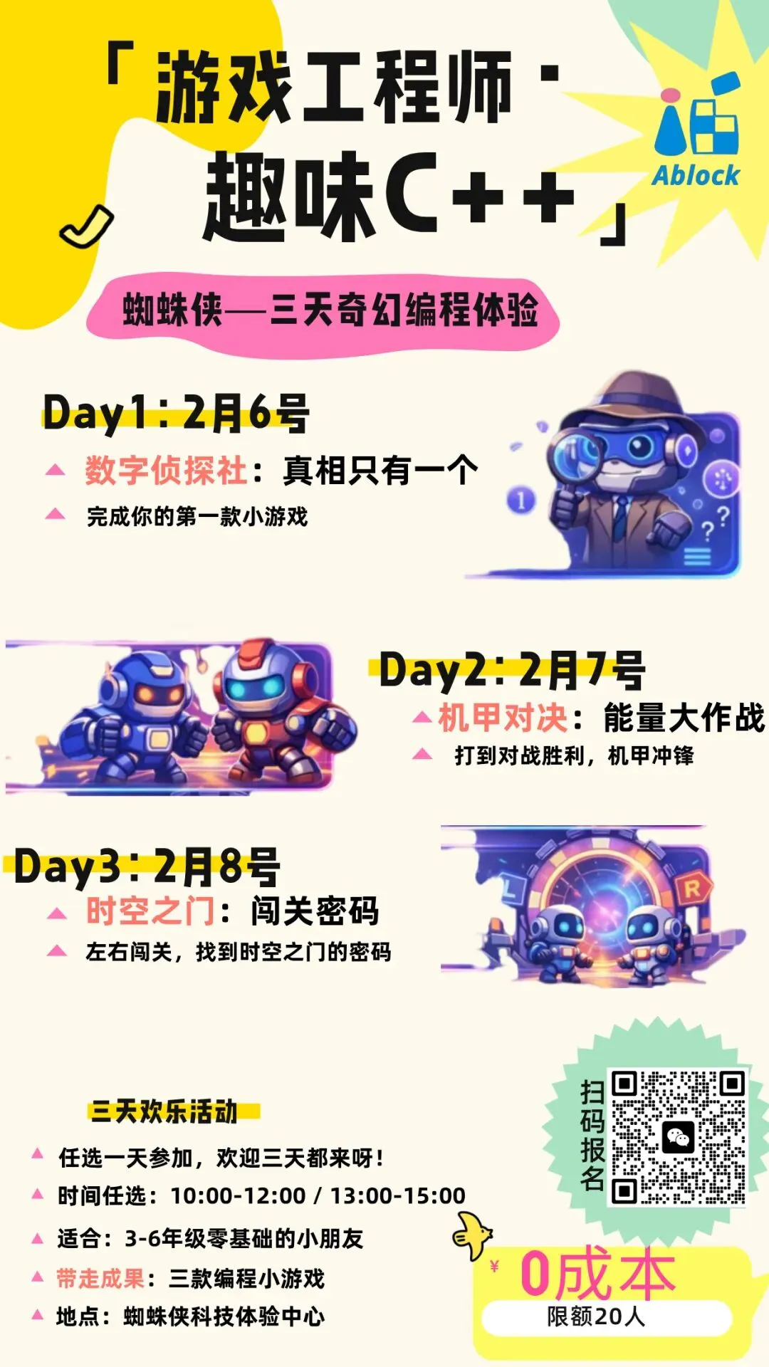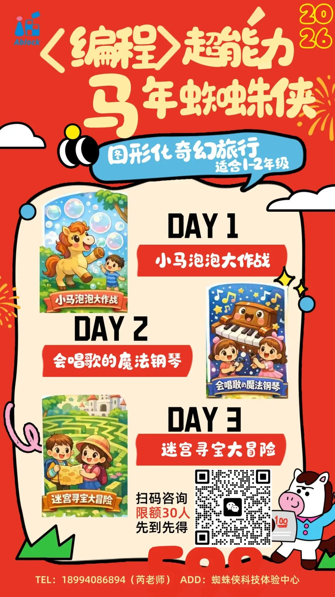 川大校友专属 值此新春来临之际,特为校友家庭的孩子们(1-6年级)特别准备了“人工智能编程训练营”——《编程超能力,马年蜘蛛侠》主题公益体验课,让孩子们免费感受游戏编程的乐趣,体验成为小小工程师的成就感!