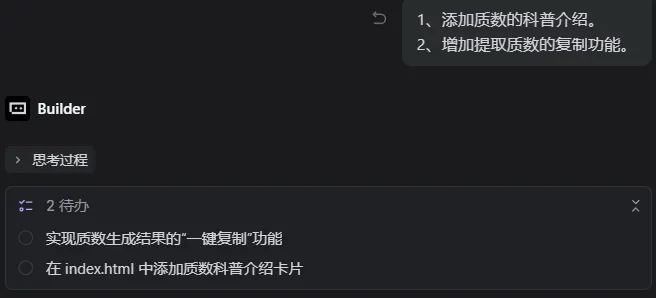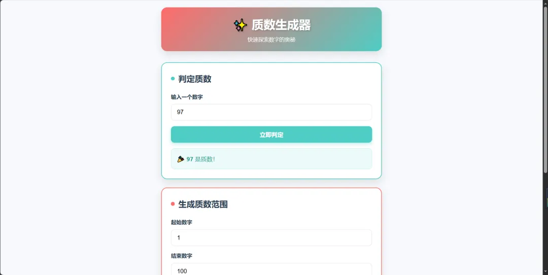 使用 AI 生成一个质数生成器工具,主要实现判定是否为质数和提取范围内的质数功能。在 TRAE 对话框中输入开发需求,可以参考如下示例。为我开发一个质数生成器,具体要求如下: 1. 使用 HTML5 实现,所有功能代码必须整合在单个 HTML 文件中 2. 实现质数的判定与生成功能: - 支持输入一个数判定是否为质数。 - 支持输入范围提取范围中的质数。 - 页面使用多巴胺配色。 - 需求适配移动端设备 |
