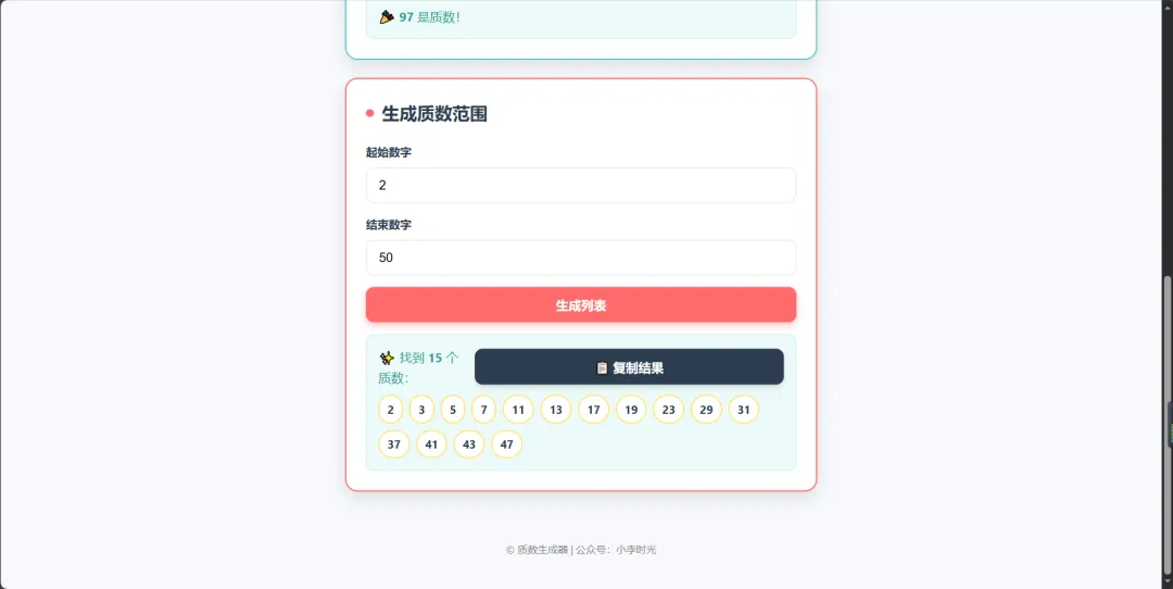 运行,可以看到实现了判定的提取范围内的所有质数功能。添加什么是质数的科普,以及复制所有质数的功能,在对话框输入:感兴趣的小伙伴,可以动起手来,制作属于自己的工具。
