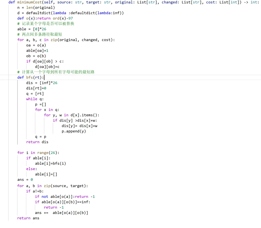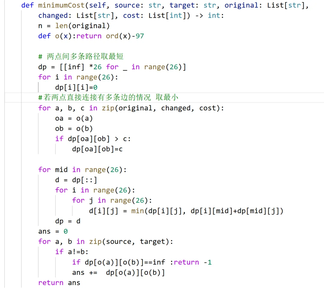 1 <= source.length == target.length <= 105source target 均由小写英文字母组成1 <= cost.length== original.length == changed.length <= 2000original[i] changed[i] 是小写英文字母1 <= cost[i] <= 106original[i] != changed[i]示例 :