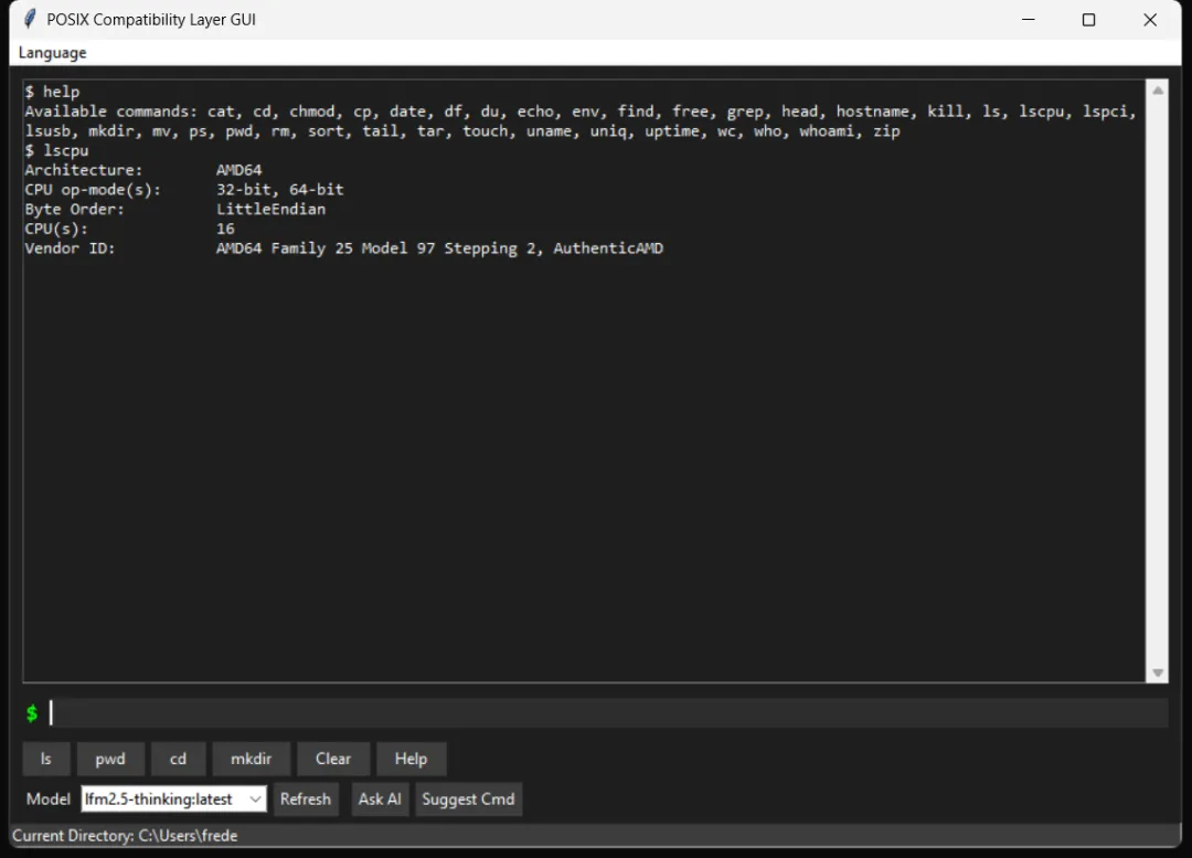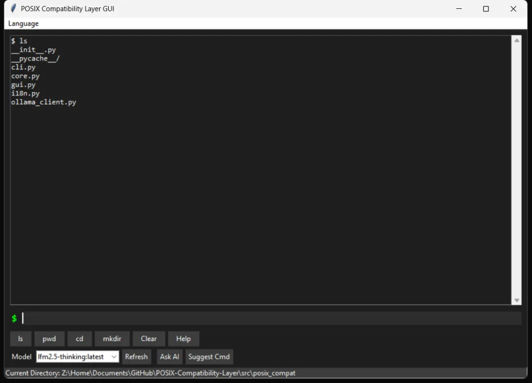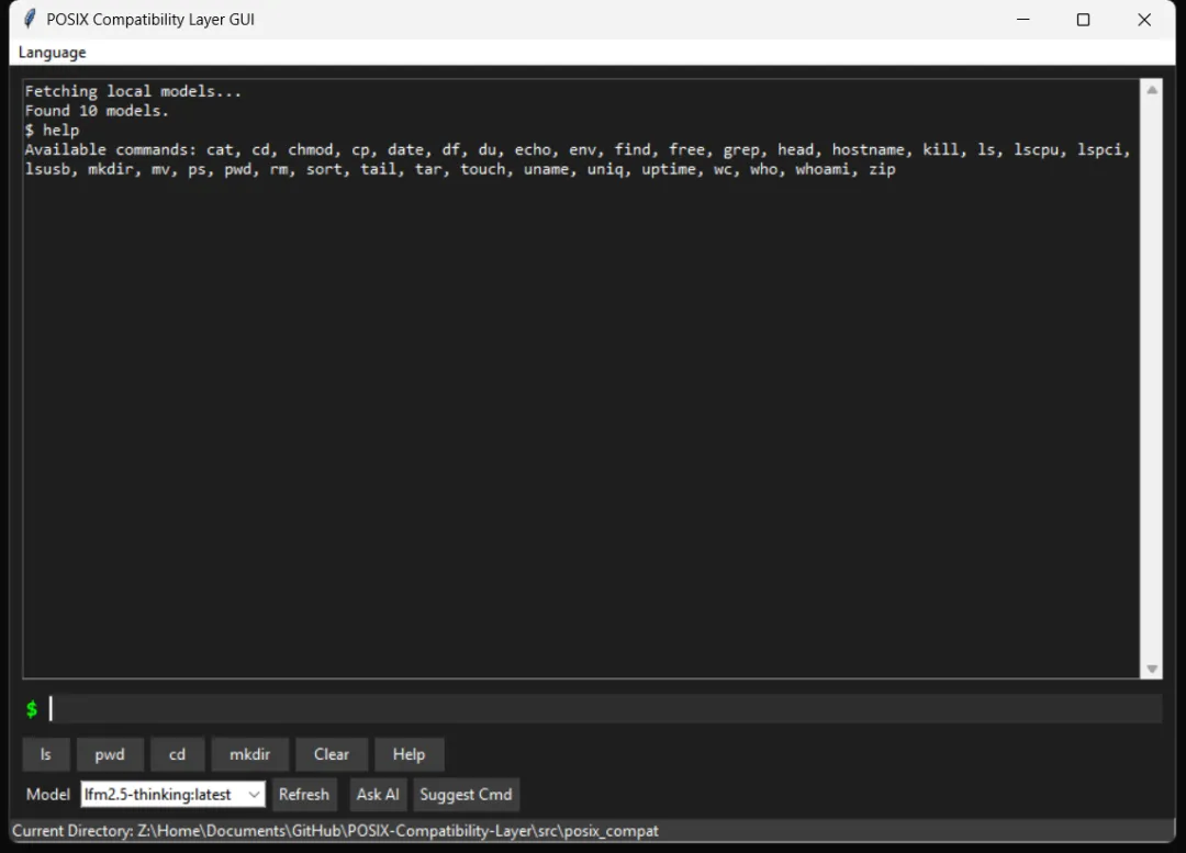 本项目并非为了替代现有的成熟 Shell 或提供生产级的跨平台解决方案,而是一次技术验证(Proof of Concept)。我们尝试构建一个轻量级的 Python 中间层,将 POSIX 标准命令作为 AI 与操作系统交互的“通用语言”。通过这个中间层,我们希望探索让本地模型(如 Ollama)通过标准化的指令集来辅助用户完成简单的文件操作和系统查询的可能性。