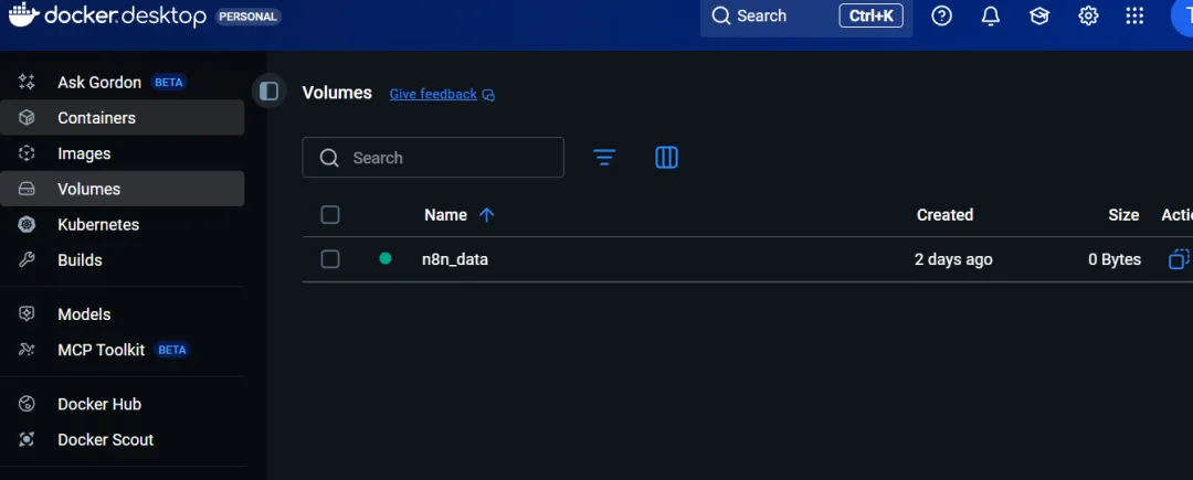 为了让 n8n 的数据能够持久化保存,我们需要先创建一个 Docker 卷: