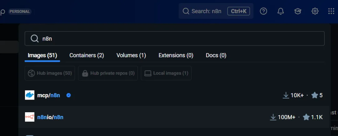 在搜索结果中选择 n8nio/n8n(通常是第二个)