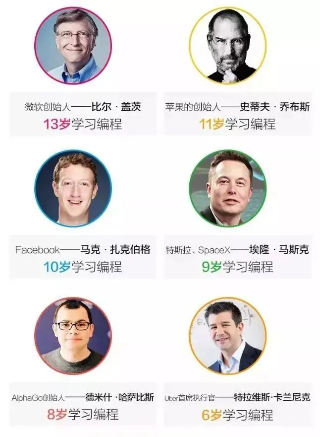 我们分析了国内外互联网公司创始人在中学、大学阶段的经历,他们几乎都有一个共同点——很早就在兴趣牵引下做项目、试错、积累技能与商业嗅觉,而且很多人接触编程的年龄之早,足以打破“等大学再学”的惯性思维: