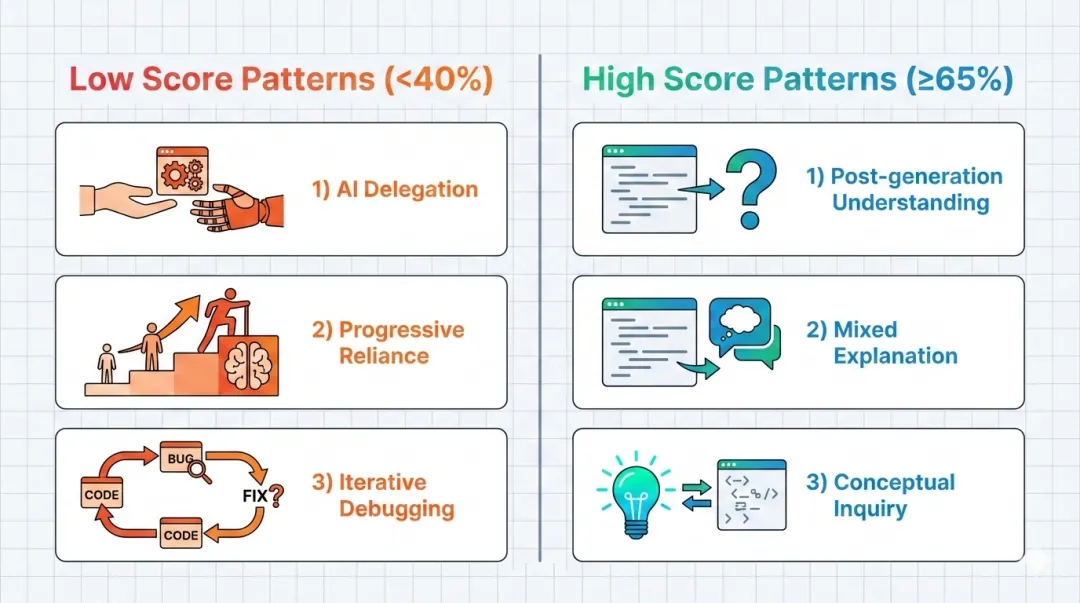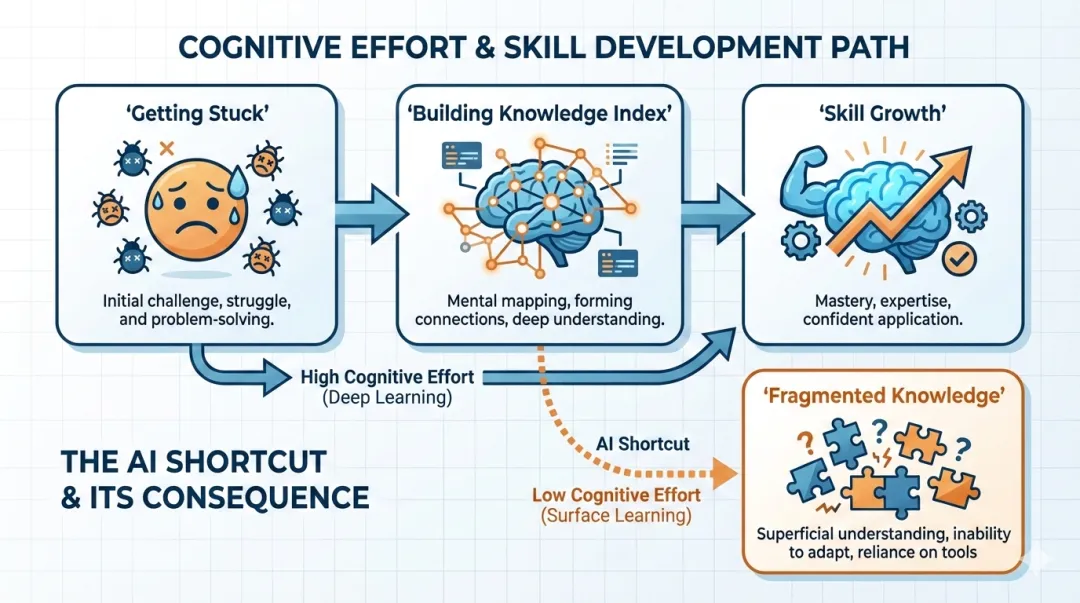 研究员发现,这种差距主要源于“认知努力”的缺失。手写组在被 bug 虐得死去活来的时候,大脑其实在疯狂建立知识索引。而 AI 组因为过程太顺了,大脑觉得“这题我会(AI 会)”,于是就停止了深度思考。