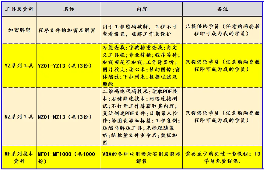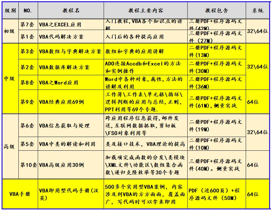 《VBA代码解决方案》(版权10028096)这套教程是我最早推出的教程,目前已经是第三版修订了。这套教程定位于入门后的提高,在学习这套教程过程中,侧重点是要理解及掌握我的“积木编程”思想。要灵活运用教程中的实例像搭积木一样把自己喜欢的代码摆好。