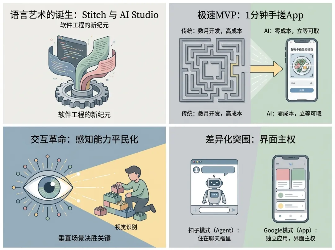 要理解这次变革的商业量级,我们必须先剖析 Google 这次抛出的大杀器——Stitch 与 AI Studio,究竟解决了什么痛点?这并非简单的辅助编程,而是将软件工程从工业制造变成了语言艺术。