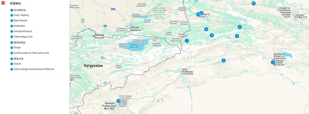 相信大家对 AI 编程 的概念一定一点都不陌生,但是哪怕如此,一定有人还在观望,没亲自动手实践过,没和 AI 进行过对话来开启 AI 编程之旅,今天我就从我自身的出发,告诉大家如何能够通过 AI 编程做出点不仅自己能用,别人也能使用的小东西,哪怕它是最简单的网页。某一天我看到一个新疆的地名——克州,然后因为我 2024 年 7 月底到 8 月初和朋友们在新疆待了 9 天,但由于当时攻略不是我做的,哪怕我回来后把游记写在了我的公众号(新疆行程参考),在看到克州这个名字的第一时间我还是不敢肯定我到底去过没有,于是我就翻看我的那篇游记,然后根据我的每日行程来把我的新疆旅游路线画出来,这样我才能精准地知道我当时到底去没去过克州,然后我的第一反应是我先用高德地图之类的来可视化一下我的路线吧,但我发现当我想要加很多途径点的时候发现并不支持。我脑海里的第二个想到了谷歌地图,此时就需要开启魔法了,因为我原来在欧洲生活过 7 年,当时也在上面制定过比如英国一周路线,柏林两日游路线之类的:从上图能看出来,1-11 是我当时去过的地点,而 12 就是克州了,这就能非常直观的得到答案,我并没去过克州,但你能发现这个过程还是有点复杂以及对国内用户还是不够友好,那么从上述背景故事是不是能衍生出 2 个小小的需求:- 根据我过往去过的地点组成的线路来确定某一个地方我到底去过没有