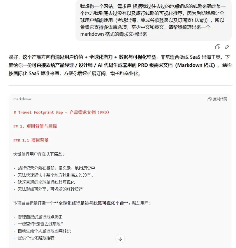 于是根据从破局学到 AI 编程相关的知识我知道了我应该去:跟 AI(kimi k2.5 agent 模式,claude code, chatgpt, gemini 等都行) 对话,生成一个产品需求文档 (Product-Requirement-Document, PRD)我想做一个网站,需求是 根据我过往去过的地点组成的线路来确定某一个地方我到底去过没有以及旅行线路的可视化推荐,因为后期我想让全球用户都能使用(考虑出海,集成谷歌登录以及订阅支付功能),所以希望它支持多语言选项,至少中文和英文,请帮我梳理出来一个 markdown 格式的需求文档出来,请给我生成可以直接下载的版本