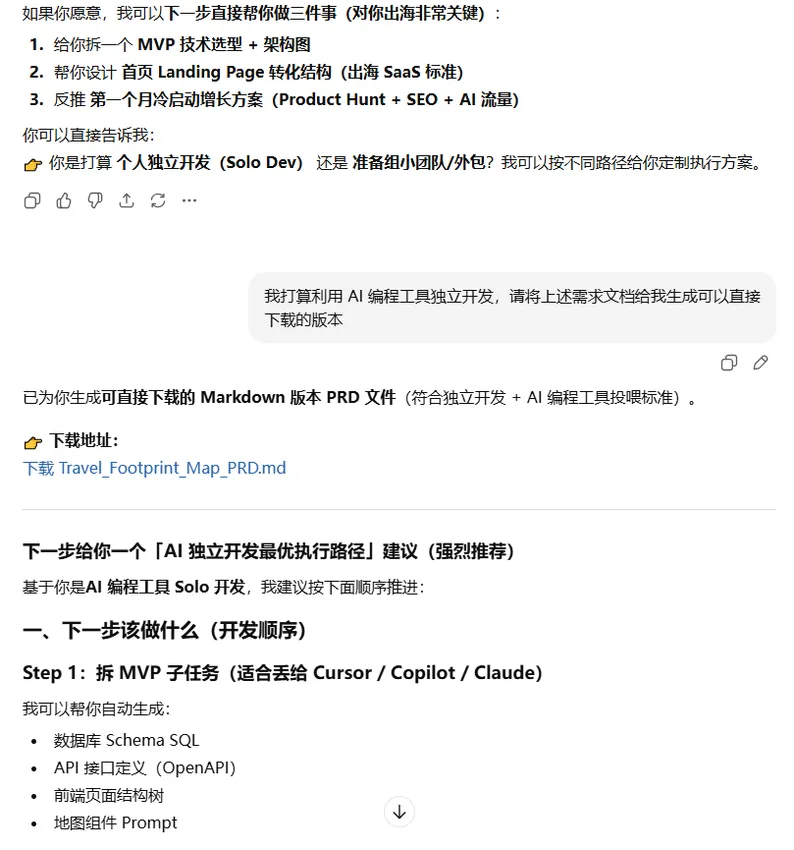 然后其实很多问题都可以通过和 AI 进行对话而逐步变得更加清晰,下面放图展示这个过程:到目前为止 PRD 是必须的,当然你也可以顺便和 AI 探讨这个产品可能的商业模式,未来的发展蓝图,不过这些都有待于去后续验证。2.去 vercel(https://vercel.com/) 生成一个原型这么做的原因是可以直接实现简单网页的部署,后续购买一个域名就可以全球访问,当然 vercel 自己也会生成一个可以海外访问的链接3.然后让 AI 编程工具基于这个需求文档生成比如网站请基于我的需求文档以及现有代码框架生成网站UI 要选择简洁大气的风格,可以自行参考当下主流旅游网站