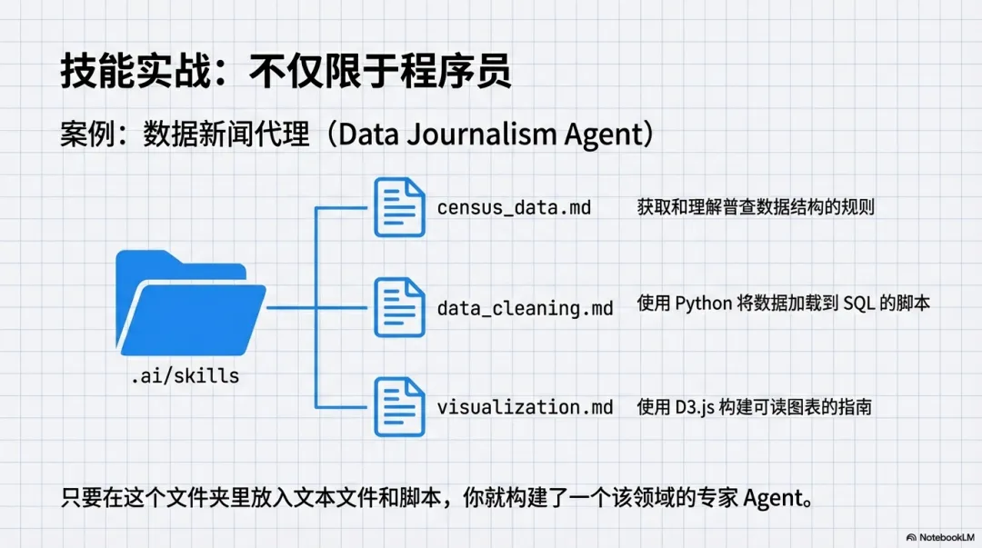 - 一个描述如何使用D3构建清晰、可读的数据可视化的技能。 恭喜你。你刚刚构建了一个‘数据新闻智能体’,它能够根据美国人口普查局发布的最新数据,发现并帮助发布新闻故事。而你实现这一切,仅仅用了一个文件夹、一些Markdown文件和几个Python脚本示例。”