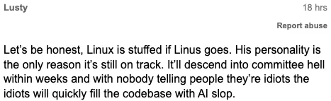 还有人直白地写道:“说句实话吧,如果 Linus 走了,Linux 基本就完了。他那种性格,才是内核还能一直跑在正轨上的真正原因。要不了几个星期,项目就会陷入无休止的委员会扯皮;一旦没人站出来直接告诉某些人‘你这是在瞎搞’,那些人就会迅速用 AI 生成的垃圾把代码库塞满。”