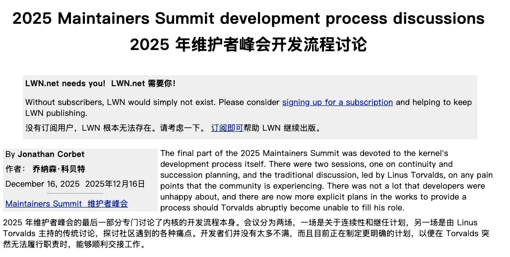 这份文档的出现,并不是 Linux 内核社区的一次心血来潮,而是源于 2025 年维护者峰会上围绕“继任与延续性”的讨论。
