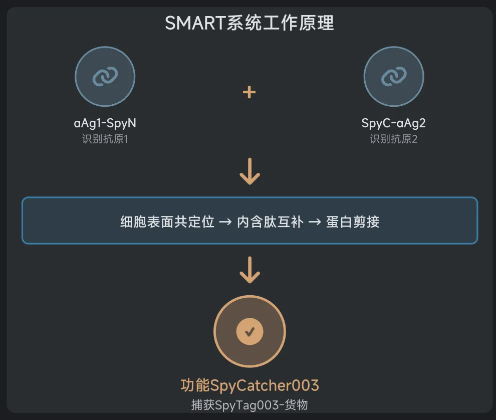 有没有一种方法,能让药物像精明的侦探一样,通过多重身份特征精准锁定目标,而绝不错杀无辜?2023年底,普林斯顿大学的Tom W. Muir教授团队带来了一个令人振奋的答案。他们发明了一种名为SMART(全称是"Splicing-Modulated Actuation upon Recognition of Targets",可以理解为"基于识别靶点的剪接调控激活技术")的新型蛋白质装置。这项技术最大的特点就是:它会在细胞表面做数学题。
