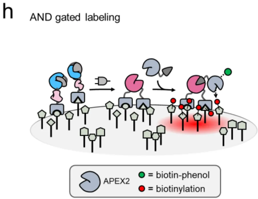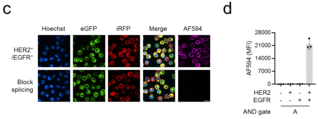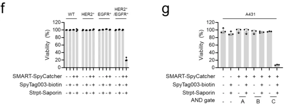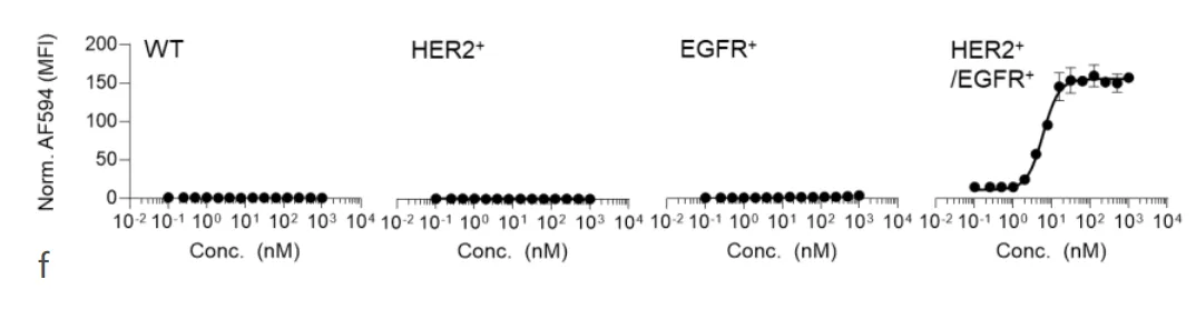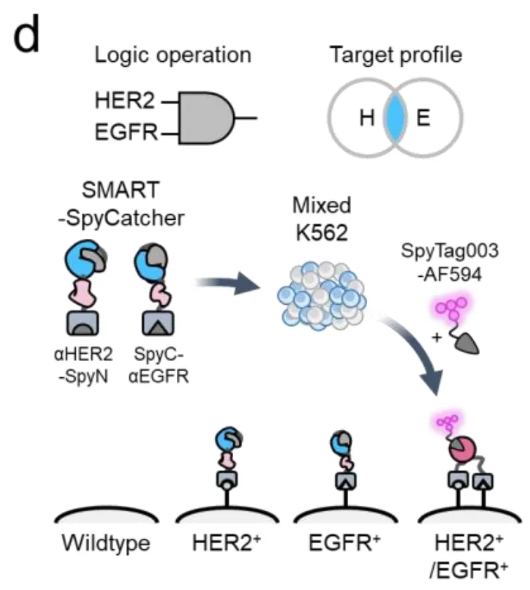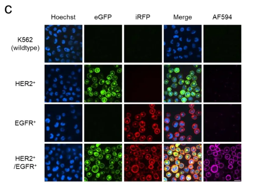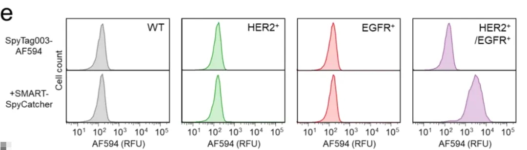 如图1c所示,当加入SpyN-HER2和SpyC-EGFR这对组合,再用带有红色荧光(AF594)的SpyTag探针检测时,只有双阳性细胞发出了强烈的紫色荧光。单阳性细胞和野生型细胞完全漆黑一片,就像从未接受过处理一样。