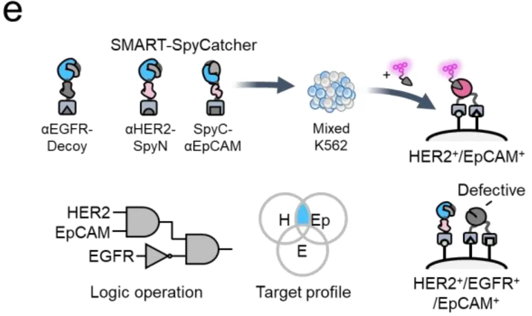 更有趣的是图2d展示的OR逻辑。科学家们设计了一个"双保险"系统:SpyN靶向HER2,但同时准备了两把SpyC——一把靶向EGFR,另一把靶向EpCAM。在混合细胞群中,只要细胞表达HER2,并且表达EGFR或者EpCAM中的任意一个,系统就会被激活。实验数据显示,HER2+/EGFR+细胞和HER2+/EpCAM+细胞都发出了强烈的荧光信号,实现了"二选一"的智能识别。