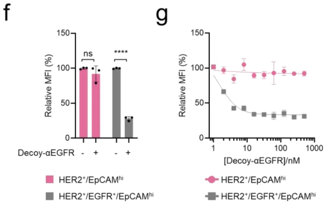 图2g显示,随着诱饵浓度的增加,三阳性细胞的信号逐渐降低,而双阳性细胞完全不受影响。这就实现了"如果有EGFR,就不干活"的NOT逻辑。