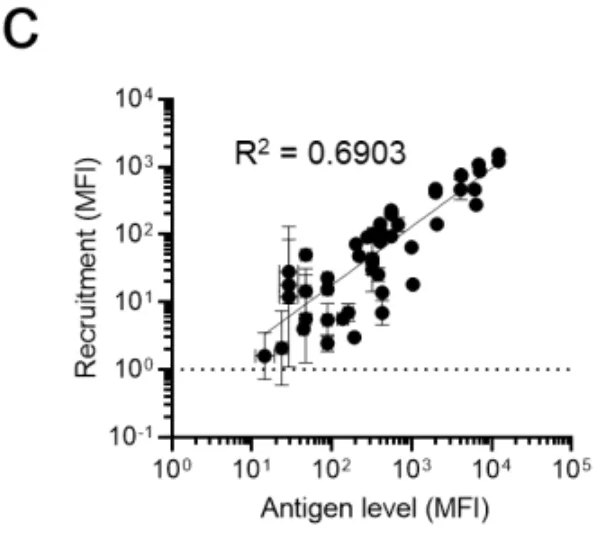 更让人印象深刻的是图1e的流式细胞术数据(可以理解为细胞通过激光检测的"体检报告")。在混合了四种细胞的群体中,只有双阳性细胞的荧光峰大幅右移,信号强度比背景高出20倍以上。