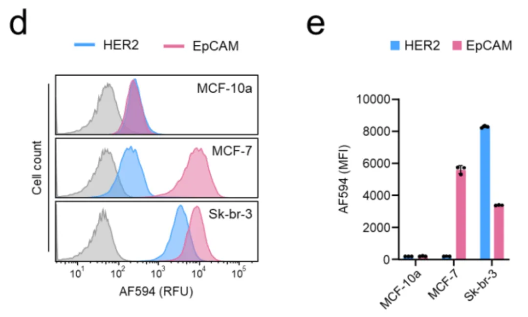 在图3d-g中,研究者们模拟了真实的肿瘤微环境,将正常乳腺上皮细胞MCF-10a(HER2低、EpCAM低)分别与乳腺癌细胞MCF-7(HER2低、EpCAM高)和Sk-br-3(HER2高、EpCAM高)混合。