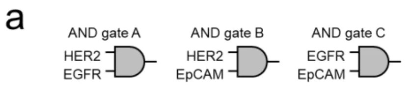 验证了AND门后,科学家们开始挑战更复杂的逻辑运算。如图2b所示,他们测试了EpCAM(另一种常见的肿瘤抗原)与HER2或EGFR的组合。结果显示,无论是[HER2 AND EpCAM]还是[EGFR AND EpCAM],系统都能精准识别双阳性细胞,而单阳性细胞保持沉默。