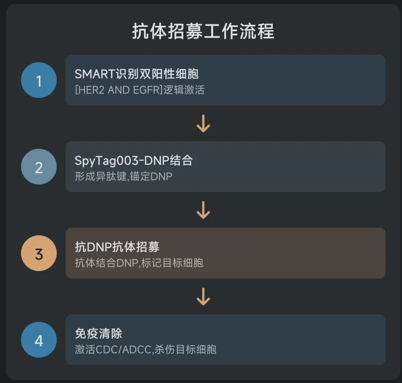 在实验中(图2f),当混合群体(包括HER2+/EpCAM+双阳性细胞和HER2+/EGFR+/EpCAM+三阳性细胞)同时接触真SpyN(抗HER2)、SpyC(抗EpCAM)和诱饵(抗EGFR)时,神奇的事情发生了:双阳性细胞(没有EGFR,所以诱饵粘不上去)正常发光;而三阳性细胞因为诱饵抢先与SpyC结合,占据了资源,导致真SpyN无法形成有效码头,信号被抑制了72%。