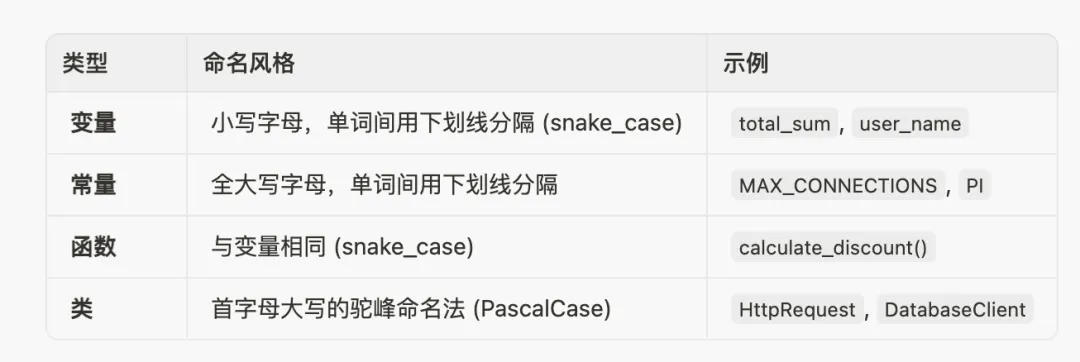 Python 摒弃了花括号,采用缩进来界定代码块的范围。这强制要求代码具有清晰的视觉结构。同一代码块内的所有语句必须保持相同的缩进量,标准做法是使用 4个空格。