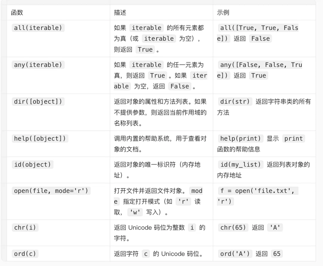 除了上述分类的函数外,Python 还提供了一些其他常用的内置函数。