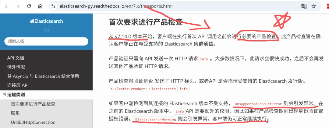 从 elasticsearch-py 7.14 起,客户端会校验服务端是否为“官方 Elasticsearch”,连接 Easysearch、OpenSearch 等会抛出类似: