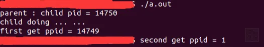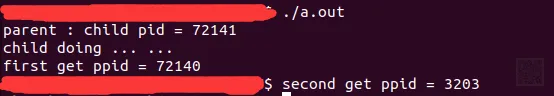 我们对这个图进行分析,可以知道,当前的运行a.out进程pid是72140,然后子进程的pid是72141,在parent-process退出后,我们再次获取ppid,可以看到输出是3203。