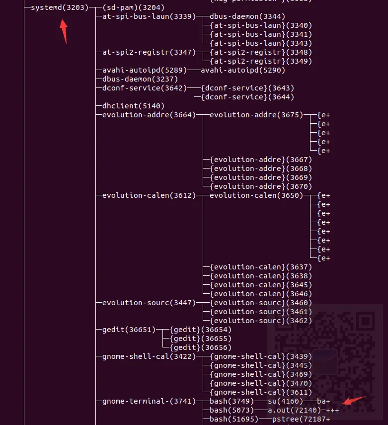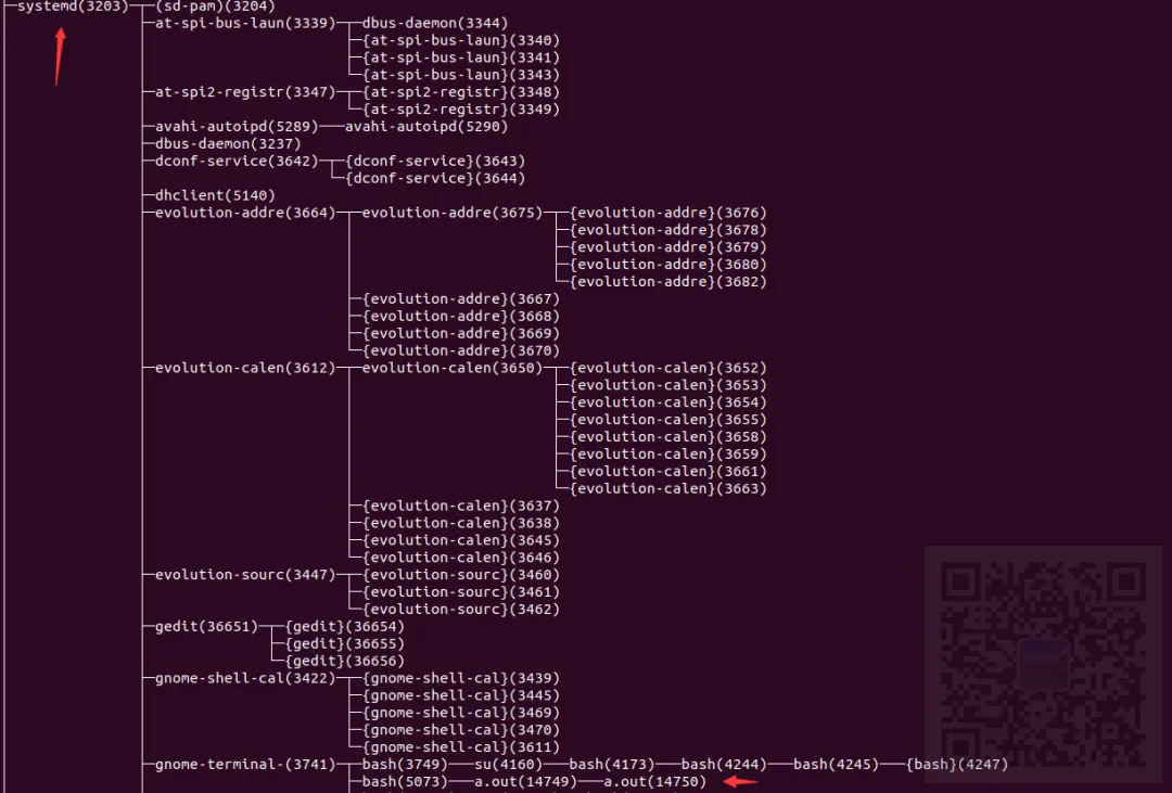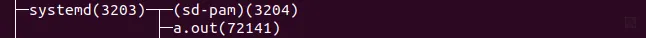 在图中我们可以知道,我们的a.out在systemd(3203)->gnome-terminal-(3741)->bash(5073)->a.out(72140)