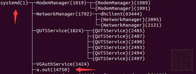 下面我们再一次做上面的测试,运行a.out,查看a.out相关的进程树,然后运行sky_hack.ko hack_pid=‘a.out进程id’,等待一段时间后,当a.out退出后,再次查看a.out的相关进程树即可。
