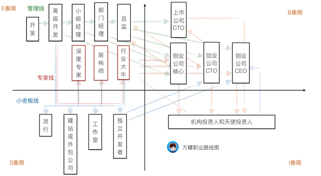 这里面把程序员的职业空间分布到了E、S、B、I 四个象限中: